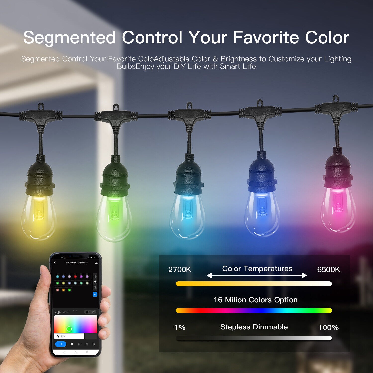 ?Connectable Festoon Lights--- Up to extend connect 3 string lights kits together (Each set 15M/48ft) by Male-Female connector, and up to control 45 Bulbs via WiFi App directly, no need to pair again; Ideal for patio, deck, backyard fence, pergola, porch, bistro, cafe.
