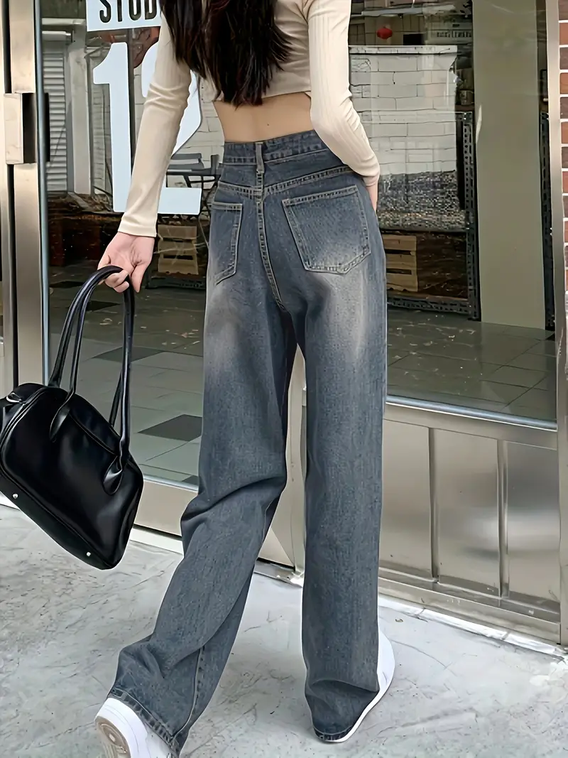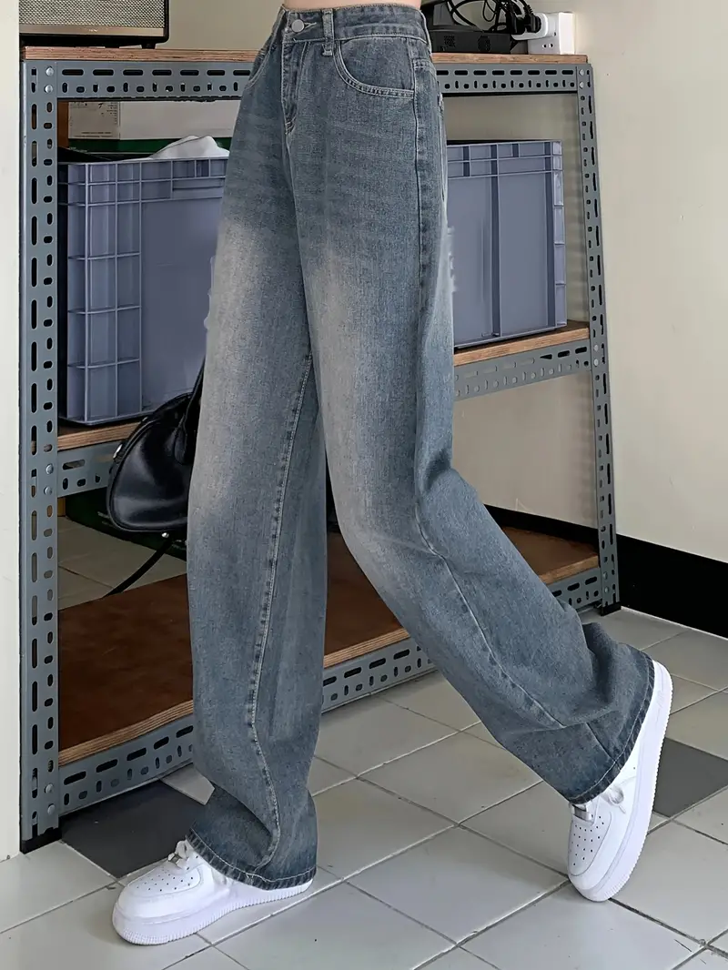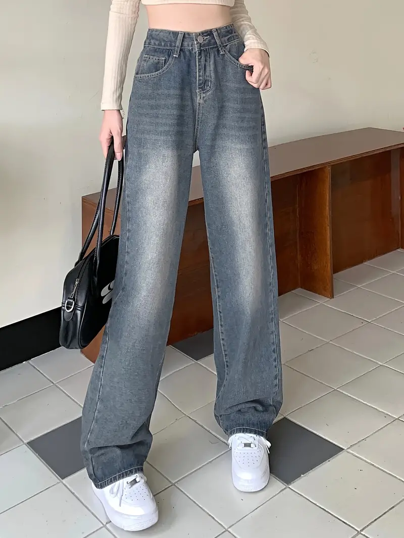Blue High Waist Baggy Jeans, Loose Fit Retro Style Versatile Wide Legs Jeans, Women's Denim Jeans & Clothing
