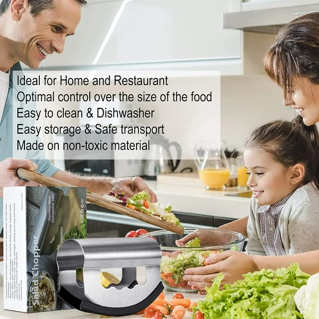 Stainless Steel Double Blade Knife Salad Chopper, Double Blades and Ergonomically Design, Mezzaluna Double Blade Chopper/ Chopped Salad Chopper/ Salad Chopper Tool/ Lettuce Chopper for Salad/ Salad Cutter for Salad Chopper Bowl. Vegetable salad chopper, make your life a little easier!