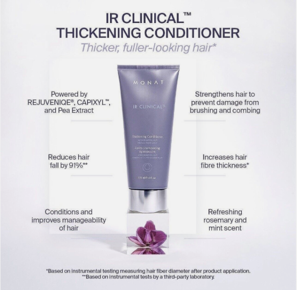 Monat IR Clinical Set Shampoo Conditioner and Serum NEW For Thinning Hair. IR Clinical System/ Brand New in box Densifying Fine to Medium Hair Types All Hair Textures The breakthrough is here! The new IR CLINICAL™ System is a complete regimen that features CAPIXYL™ and a unique blend of ingredients that helps to strengthen and thicken hair while also preventing damage from brushing and combing. Developed in collaboration with a world-renowned expert in hair and scalp science, this lightweight, non-greasy serum is proven to help boost hair growth, immediately reduce breakage, and has shown noticeable results of thicker, fuller-looking hair.o |