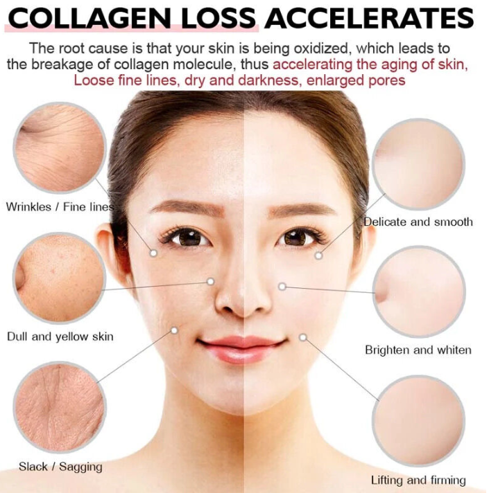 ▶The root cause is that your skin is oxidized, leading to the decomposition of collagen molecules, accelerating skin aging, loose fine lines,dryness and dullness, and enlarged pores.