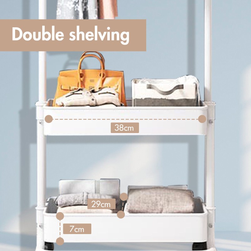 Rolling Garment Rack on Wheels, Entryway Clothing Rack with 2 Tier Metal Basket