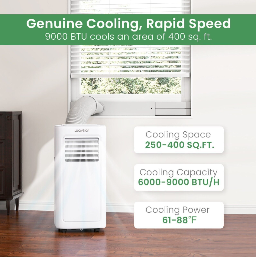 POWERFUL & EFFICIENT COOL AIR CONDITIONER - This Waykar air conditioner features 9,000 BTU cooling power to reduce temperatures between 61°F-88°F for rooms 250-400 sq.ft. It’s the ideal small air conditioner for living rooms, bedrooms, apartments, dorms, offices, cabins, and more.