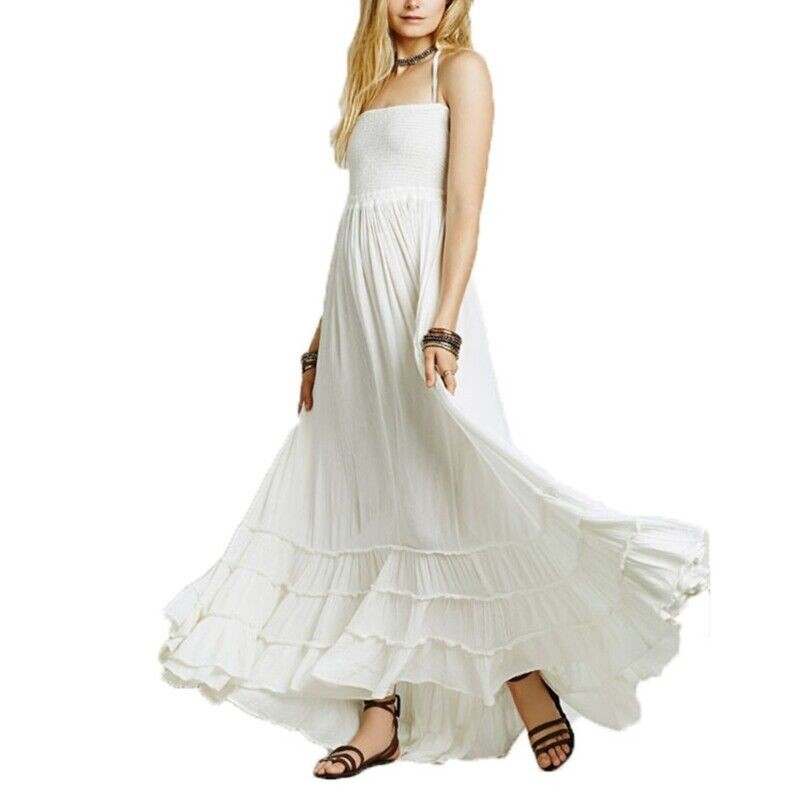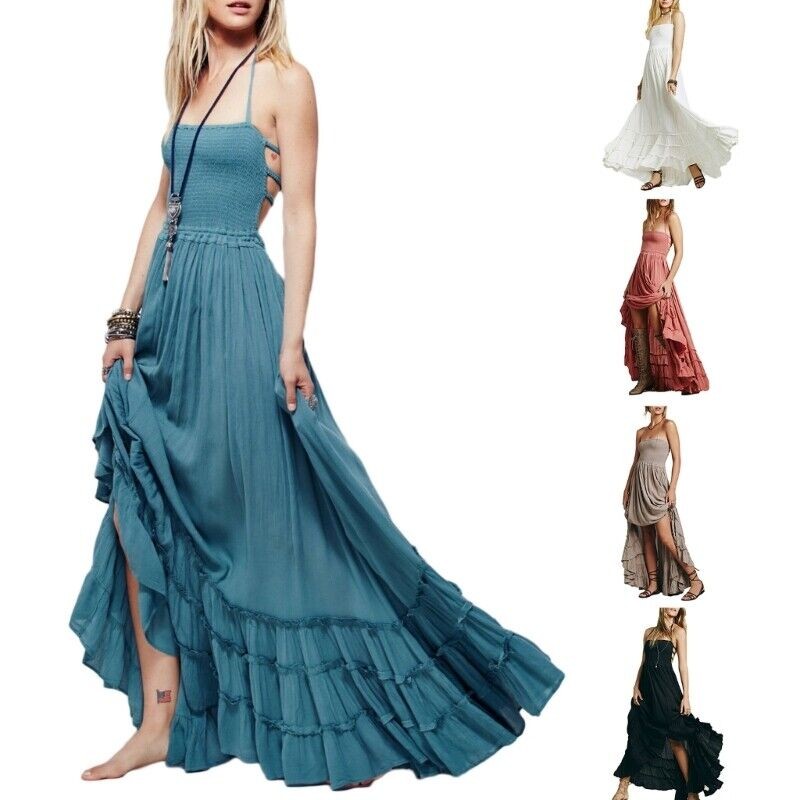 Women's Holder Strap Maxi Dress Solid Color Smocked Long Dress Loose Fit Dress