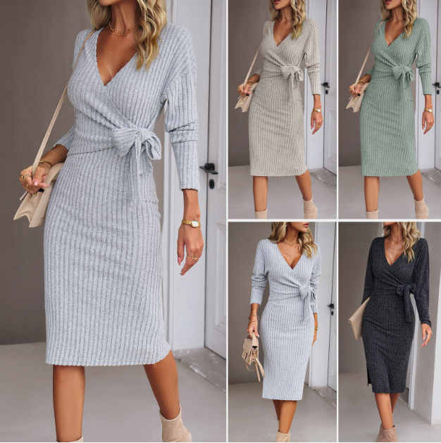 Womens V Neck Long Sleeves Belt Lace Up Slim Fashion Midi Knitted Sweater Dress